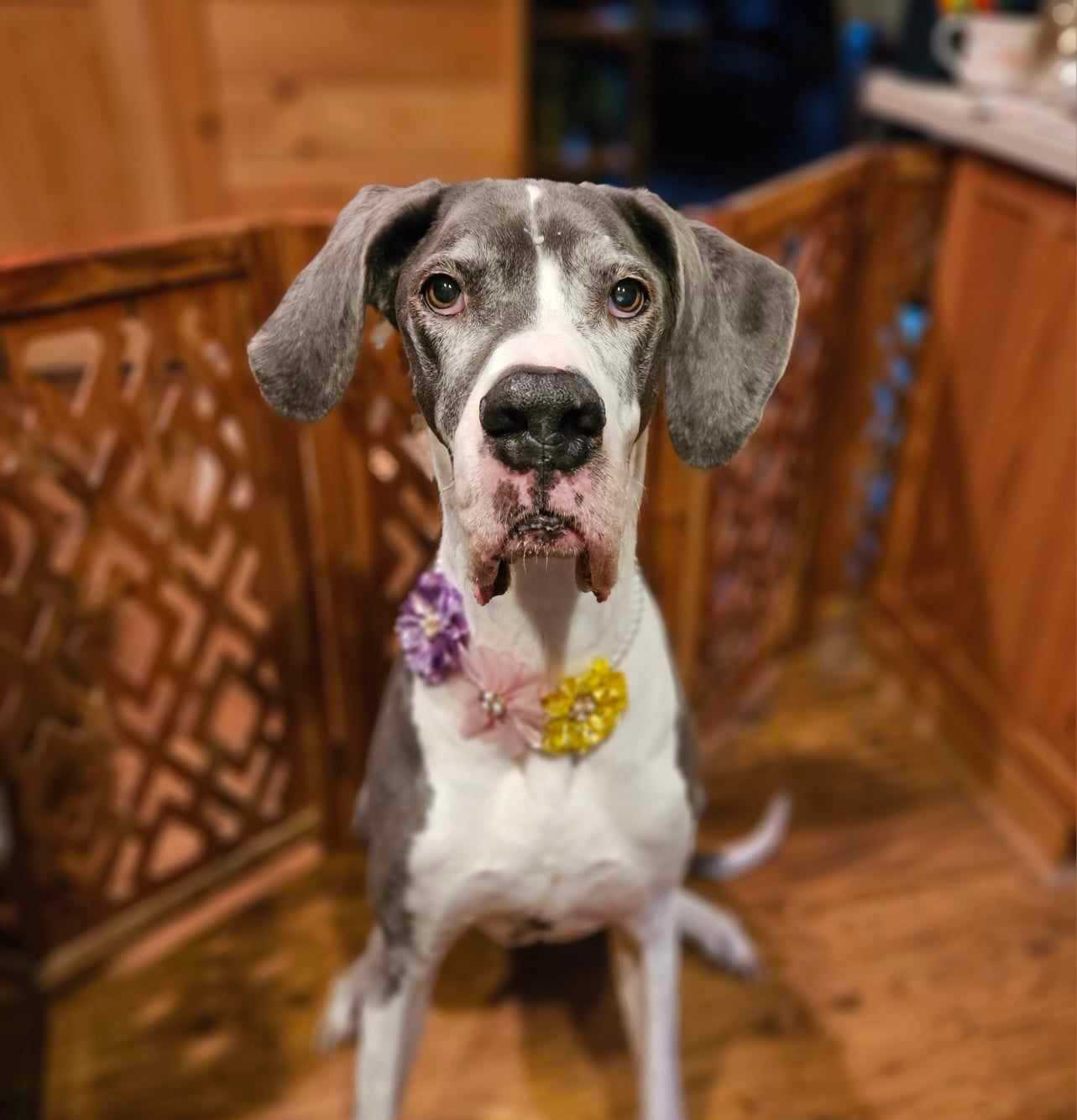 A one-year-old Great Dane specializing in stirring up excitement, keeping tails wagging with motivation, and ensuring everyone's bowl is full of wild enthusiasm.